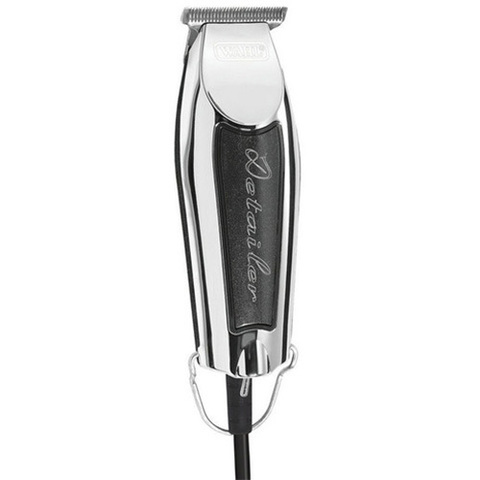 Триммер Wahl Detailer незаменим для создания четких линий и выстригания волос в труднодоступных местах. Изящная серебристая машинка с чёрной вставкой в руках мастера выглядит как драгоценность, а не обычный рабочий инструмент.