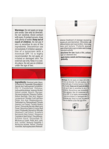 Состав: Салициловая кислота, лимонная кислота, ликопен, койевая кислота, экстракт листьев зеленого чая, цветки ромашки аптечной, гликоген, экстракт листьев размарина лекарственного, фитиновая кислота, лецитин, молочная кислота, гексаноил дипептид-3 норлецин ацета, ретинол.